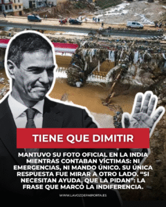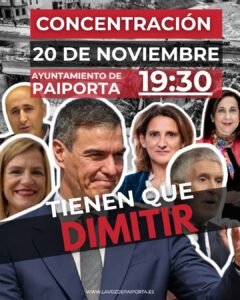 El próximo miércoles 20 de noviembre a las 19:30 horas, frente al Ayuntamiento de Paiporta, tendrá lugar una concentración ciudadana para exigir responsabilidades políticas tras la DANA del 29 de octubre de 2024, que dejó víctimas, pérdidas millonarias y un municipio aún pendiente de ayudas y obras reales. El cartel difundido bajo el lema “Tienen que dimitir”, muestra al presidente… Lee más: Concentración en Paiporta el 20 de noviembre: «Tienen que dimitir» - Mantuvo su foto oficial en la India mientras contaban víctimas: ni emergencias, ni mando único. Su única respuesta fue mirar a otro lado. “Si necesitan ayuda, que la pidan”: la frase que marcó la indiferencia.