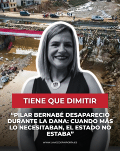 Los datos revelan negligencia, descoordinación y omisiones graves en la actuación de la representante de Pedro Sánchez durante la catástrofe del 29 de octubre de 2024. Mientras miles de vecinos de la Horta Sud luchaban por salvar sus casas y sus vidas, la delegada del Gobierno en la Comunitat Valenciana, Pilar Bernabé, permanecía ausente del… Lee más: “Pilar Bernabé desapareció durante la DANA: cuando más lo necesitaban, el Estado no estaba” - Teresa Ribera: la ministra del clima que dejó ahogar a Valencia