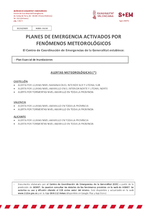 Sin embargo, a las 06:30 horas del lunes, el Centro de Coordinación de Emergencias de la Generalitat Valenciana (112 CV) publicó su parte oficial de planes activados por fenómenos meteorológicos, en el que se indica que la provincia de Valencia se encontraba en alerta amarilla por lluvias y tormentas, sin constar alerta roja ni naranja activa en ese momento para Paiporta.